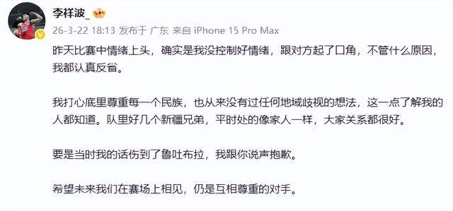 事件發酵後,李祥波於22日通過社交媒體發布致歉聲明:“我打心底尊重每一個民族,從未有過任何地域歧視的想法。若我的言語傷害了魯吐布拉,我向你真誠道歉。”其措辭誠懇,明確將事件歸因於“情緒上頭”,並主動承擔溝通責任,展現出球員應有的擔當。