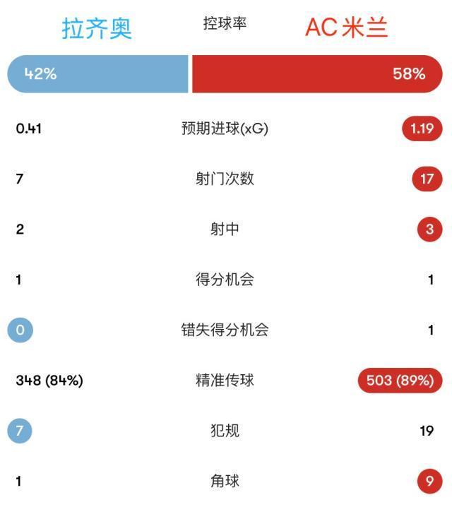 拉齊奧全場7次射門,預期進球數為0.41,隻有2次射正,而米蘭17次射門,預期進球數為1.19。