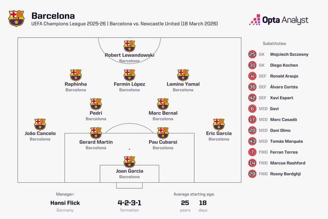 歐冠1/8決賽次回合,巴塞羅那主場對陣紐卡斯爾聯,此役巴薩首發平均年齡為25歲18天,這是巴薩隊史歐冠淘汰賽最年輕的首發陣容。