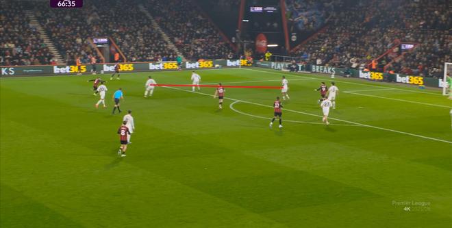於是在這次轉換中,伯恩茅斯擊穿曼聯的中路,隨後從左路送上傳中: