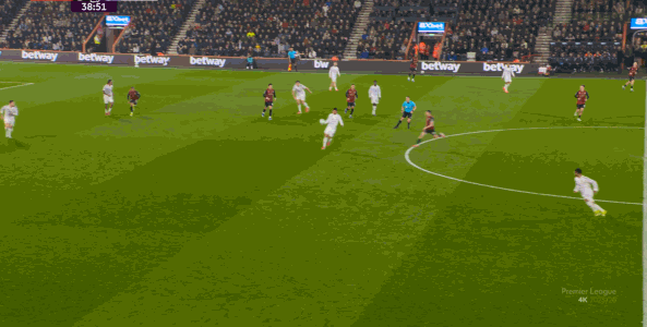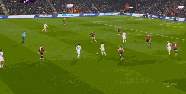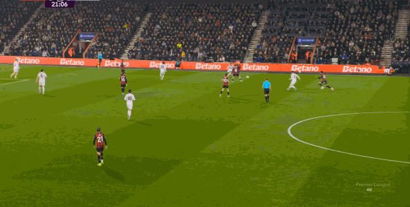 如果布魯諾一直保持拉揚接球時的站位,他是可以堵住橫移線路,從而降低伯恩茅斯進攻效率的: