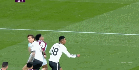 所以進入30分鍾區間,也就是靠跑動拉強度的伯恩茅斯多少該出現下滑的時候,曼聯的威脅進攻逐漸上線,門前真正的好機會開始出現,第35分鍾這次後點的攻門,其實應該把握住的: